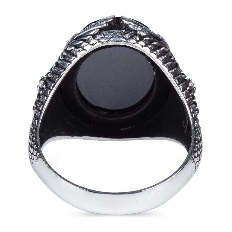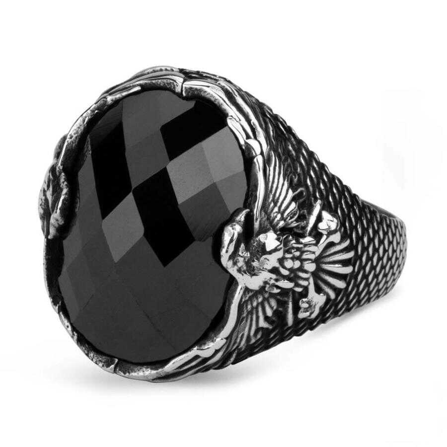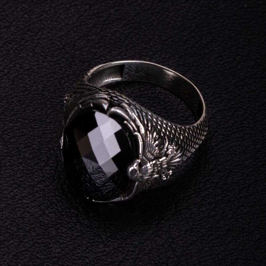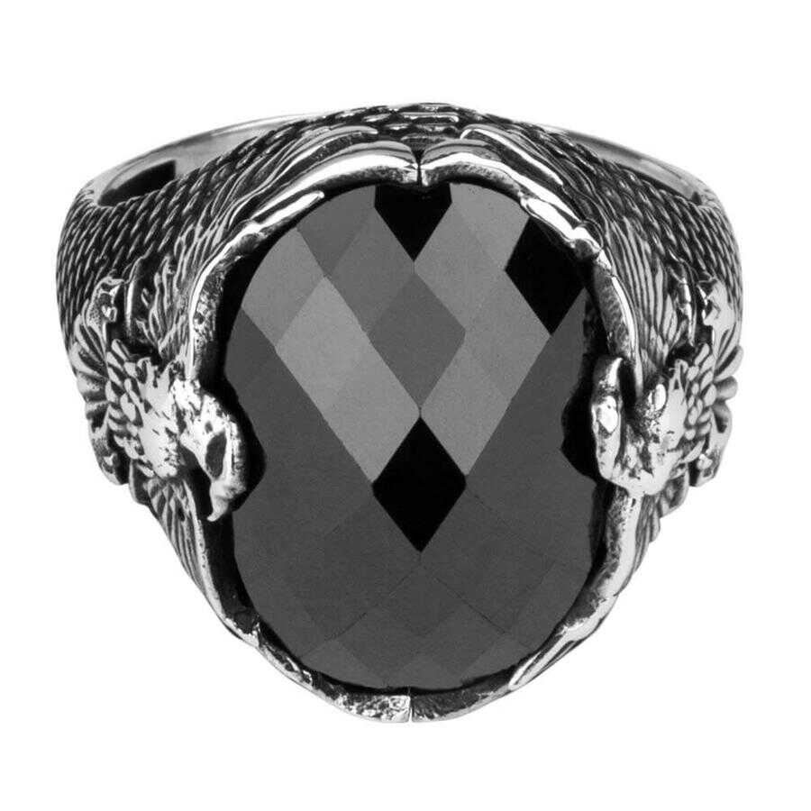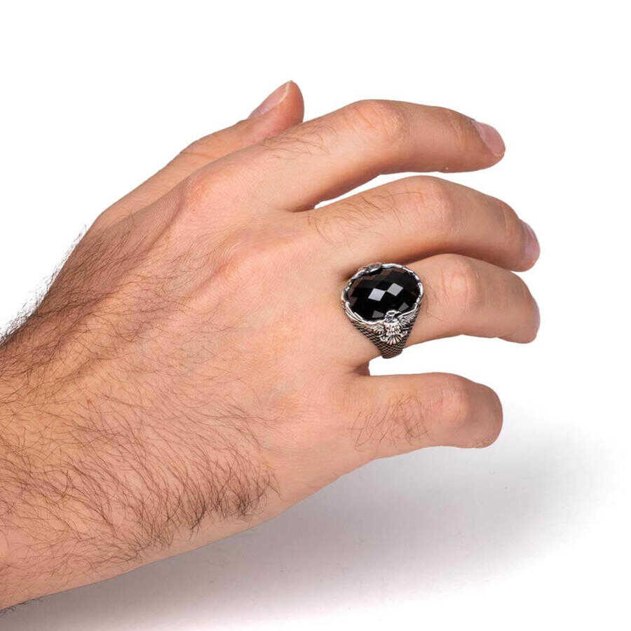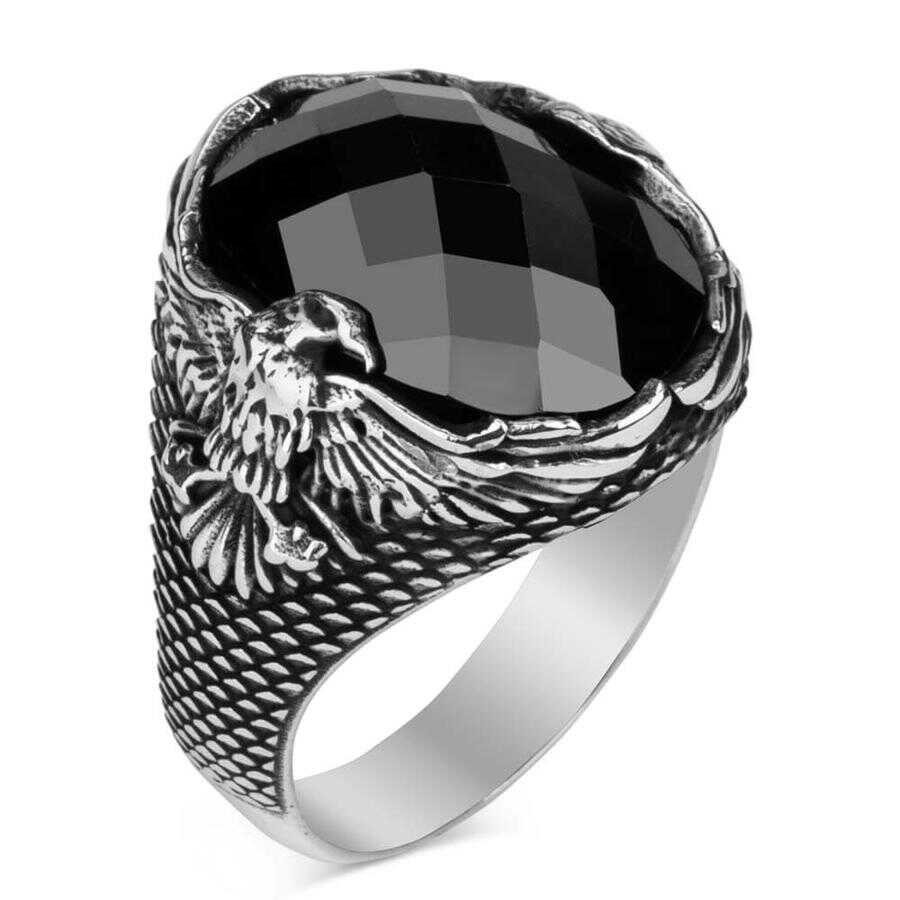 Kartal Motifli Fasetalı Siyah Zirkon Taşlı Gümüş Erkek Yüzük
