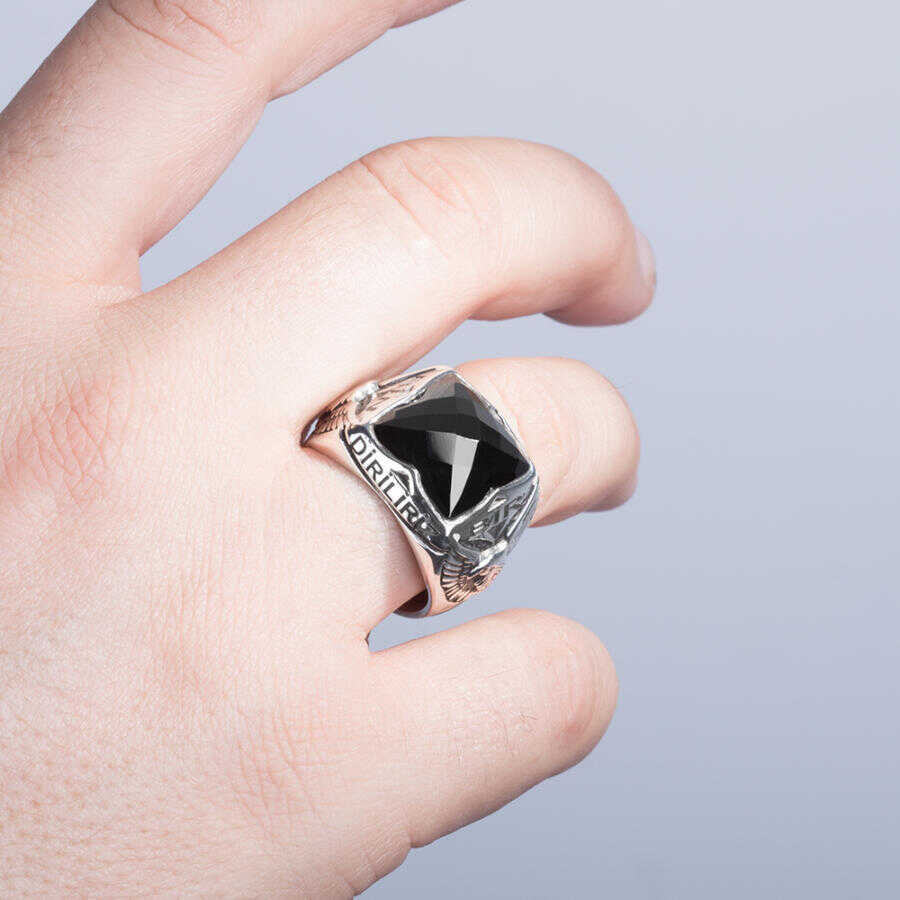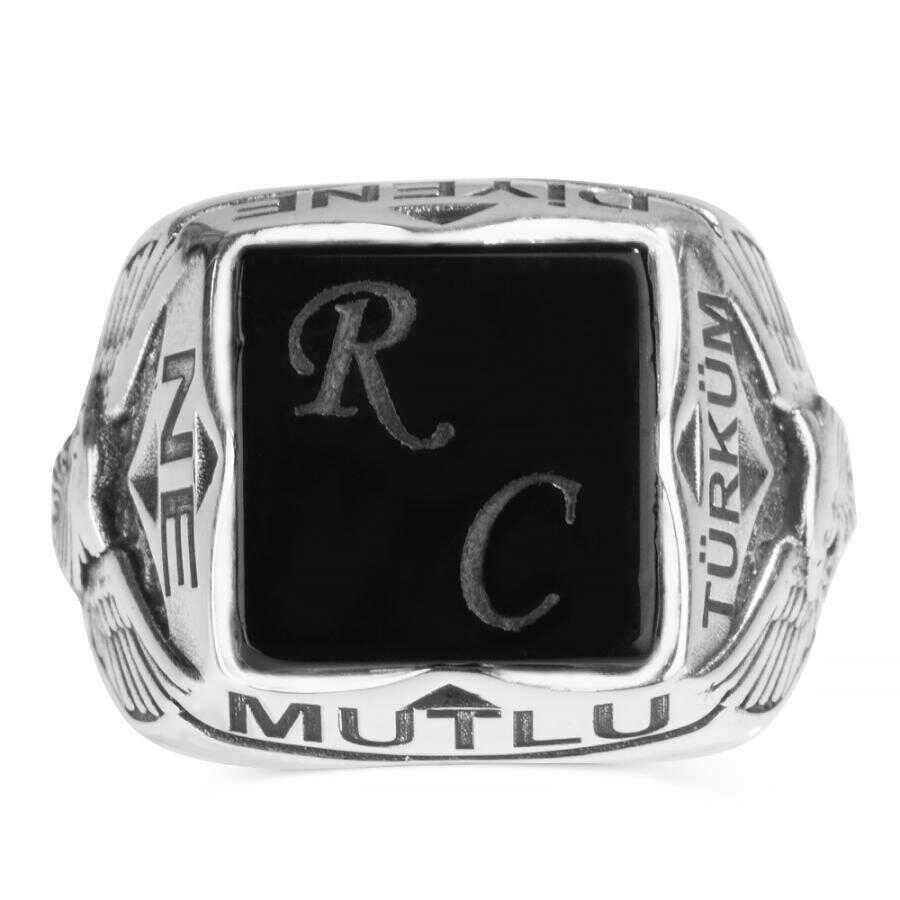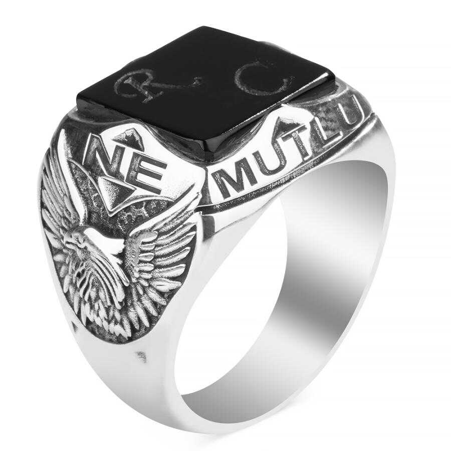 Erkeklerin günlük hayatta şıklıklarını tamamlamak için kullandıkları gümüş yüzükler taşlı tasarım üzerine harf yazdırma özelliği ile karşınızda. Türk tarihinde mitolojik olarak hakimiyeti sembolize eden kartal figürüne yer verildiği bu aksesuar işçiliğinde oniks taşı kullanılmış, taş üzerine lazer yöntemiyle harf işlenmiştir. Dört köşeli olarak yüzük yanlarına Atatürk'ün tarihi sözü olan " Ne Mutlu Türküm Diyene" yazısı işlenmiştir. Siz de bu özel tasarım aksesuara sahip olarak dikkatleri üzerinize çekebilir, gündelik hayatta kolayca tarzını oluşturabilirsiniz. Bu aksesuarı erkek arkadaşınıza ya da eşinize hediye olarak da sunabilirsiniz. Dilerseniz kişiselleştirme bölümünden yararlanarak yüzük halkası içine ya da yüzük yanlarına farklı bir yazı yazdırarak ürünü size özel hale getirebilirsiniz.