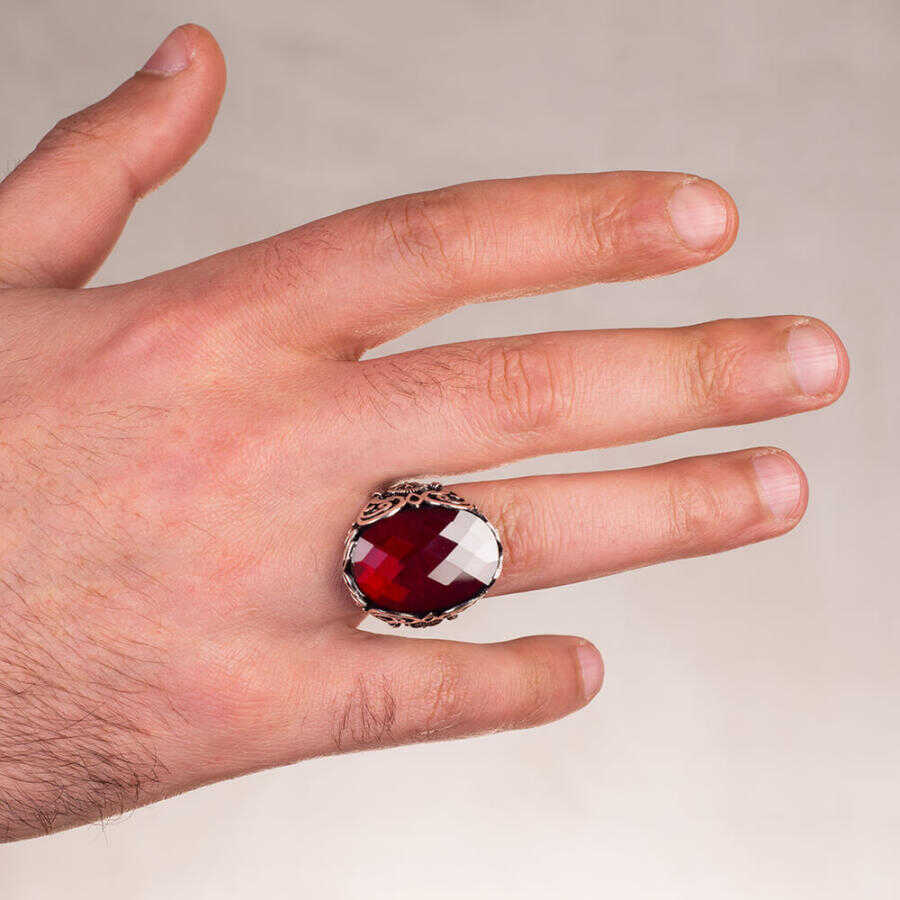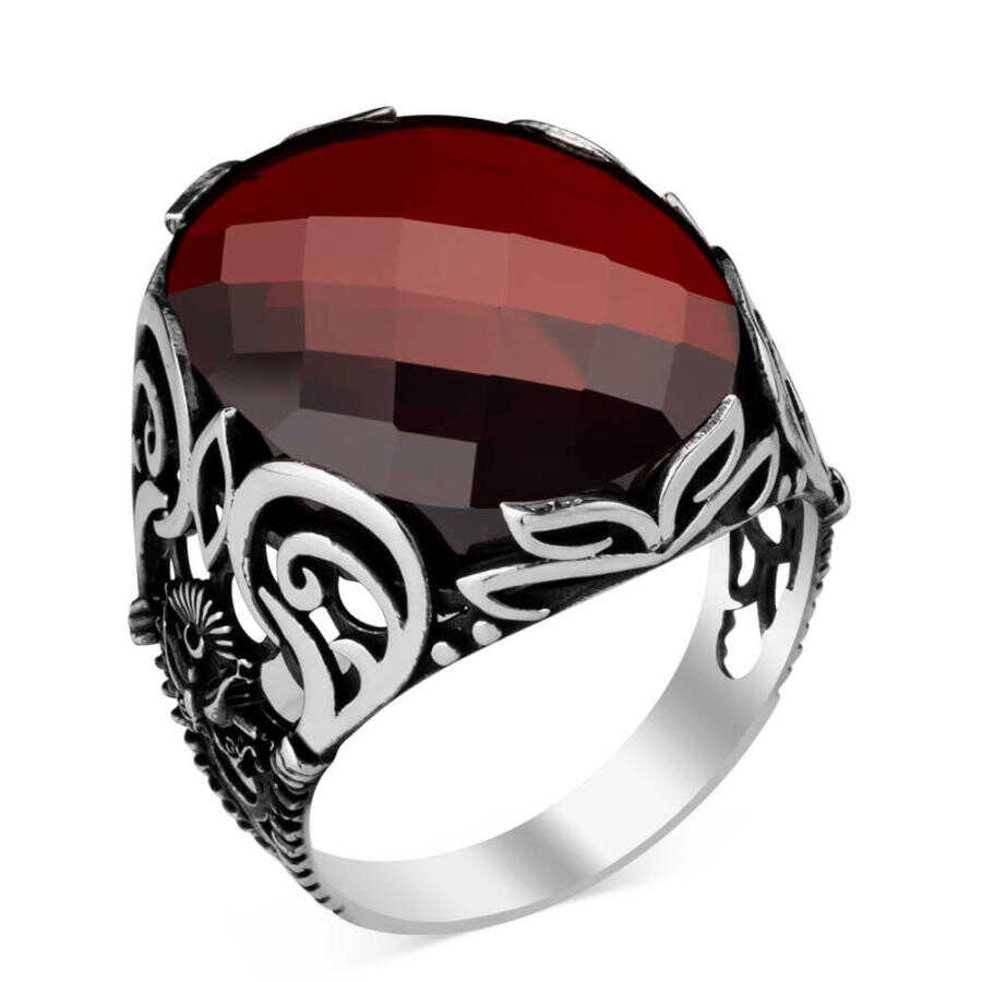 Osmanlı Arma Motifli Fasetalı Kırmızı Zirkon Taşlı Erkek Yüzük