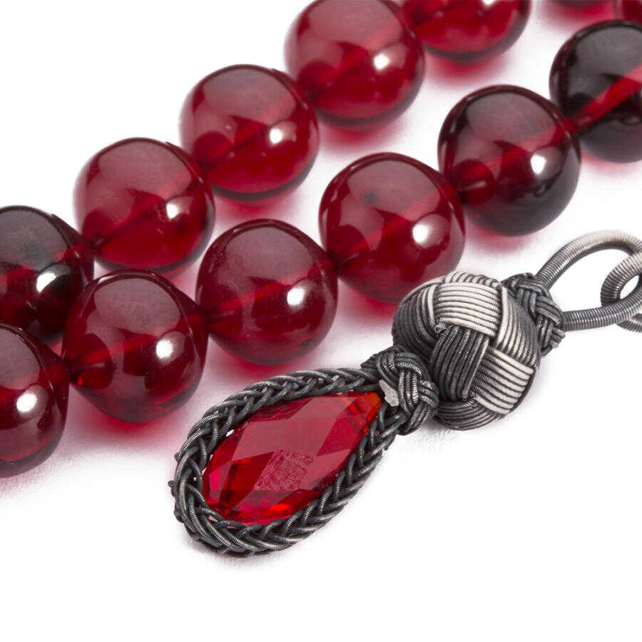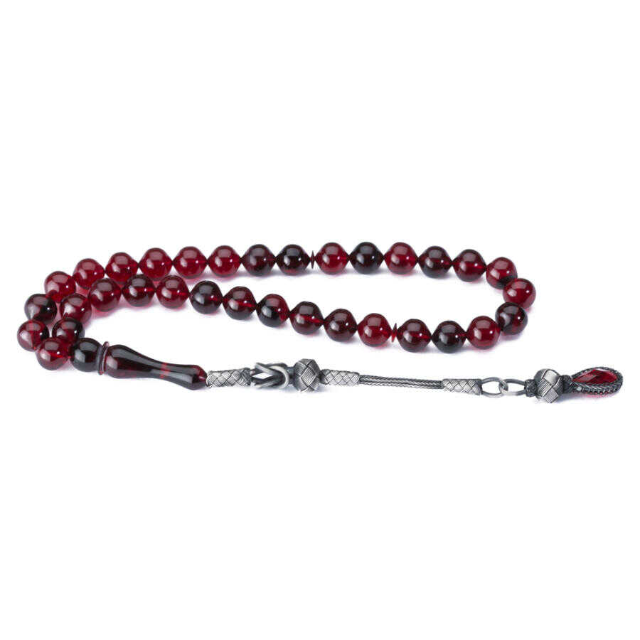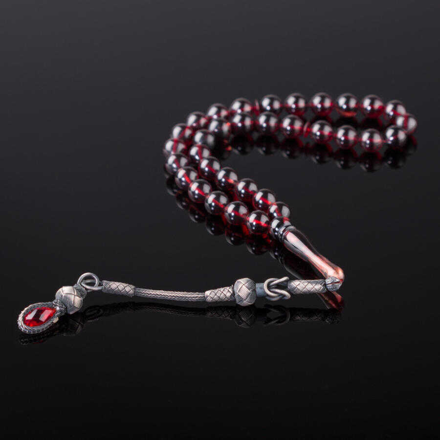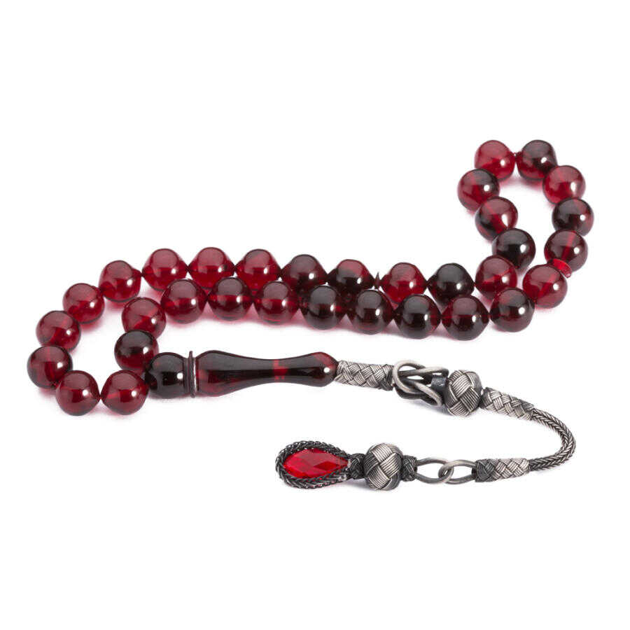 Tesbihler arasında özel bir yeri olan kehribar taneleri özellikleri itibariyle üzerinizdeki negatif enerjiyi pozitif enerjiye dönüştürerek zinde kalmanızı sağlarlar. Bu gümüş kazaz püsküllü tesbihteki kırmızı renk taneler açık ve koyu renk tonlarda ışıkta renk değiştirmesiyle sizleri büyüleyecek. Tam boyu 34 cm olun bu tesbih yuvarlak kesimi andıran 8.5x10.5 mm ölçülerde kesilmiştir.