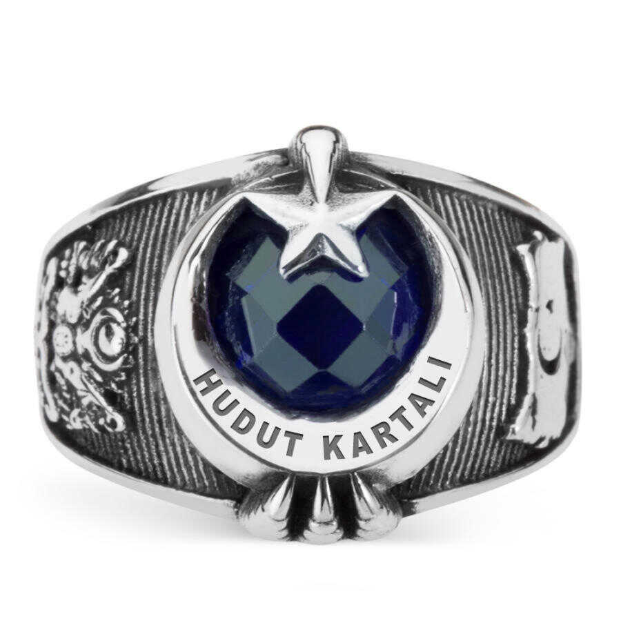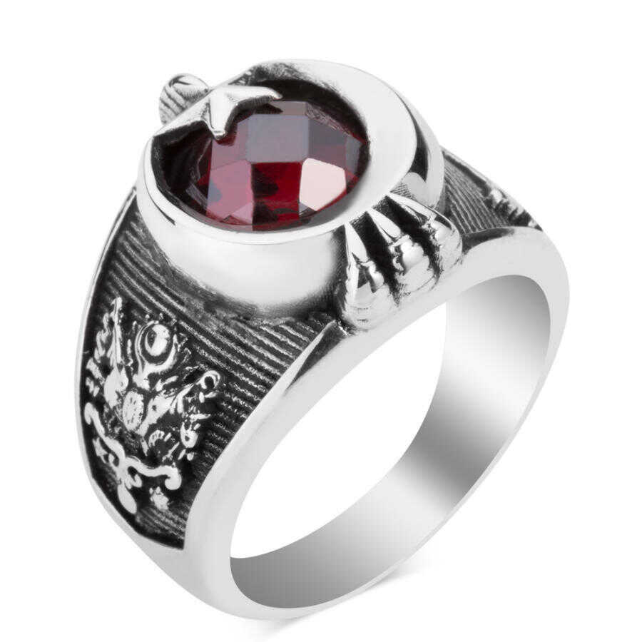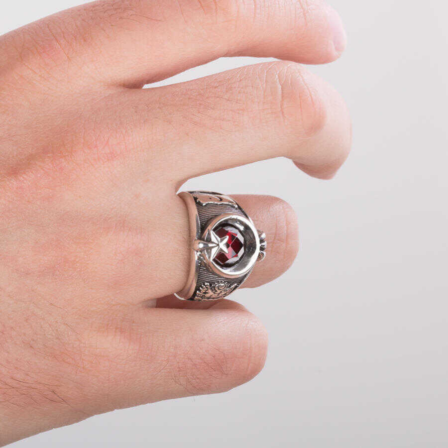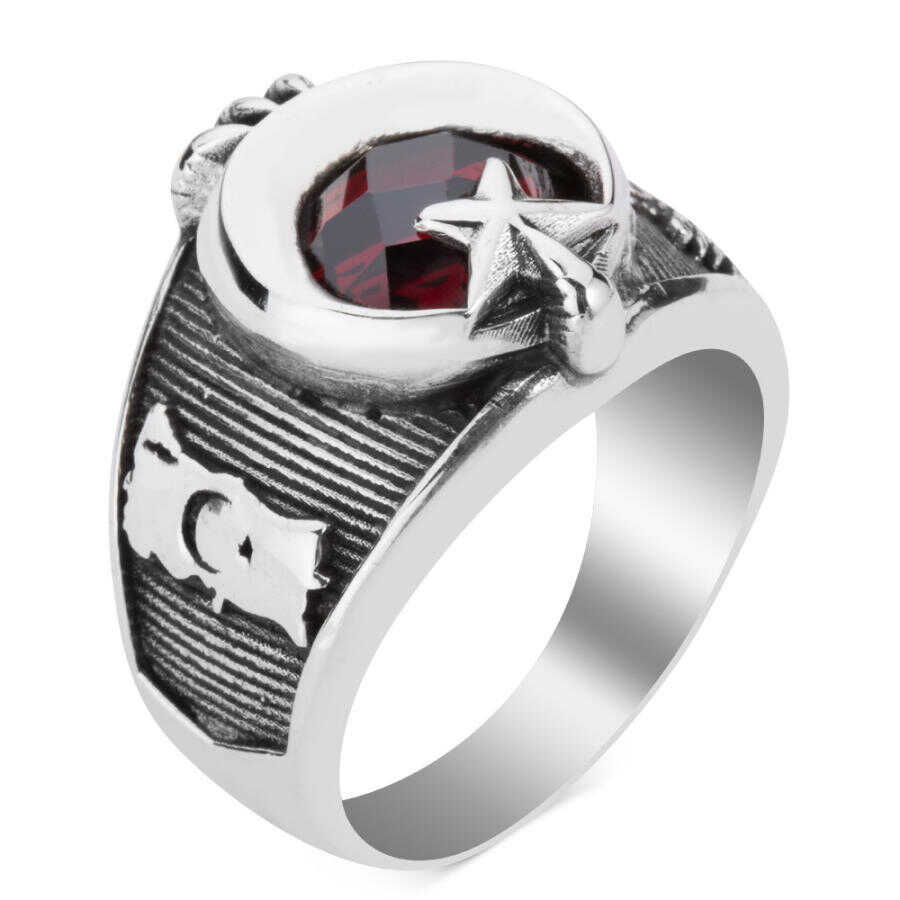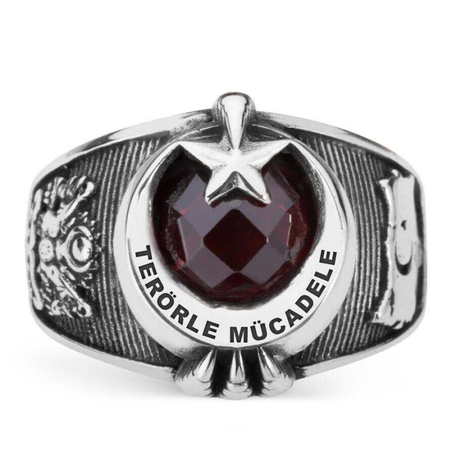 Terörle mücadele ekipleri için hazırlanan kırmızı zirkon taşlı 925 ayar gümüş ay yıldızlı "Terörle Mücadele" yüzüğü.