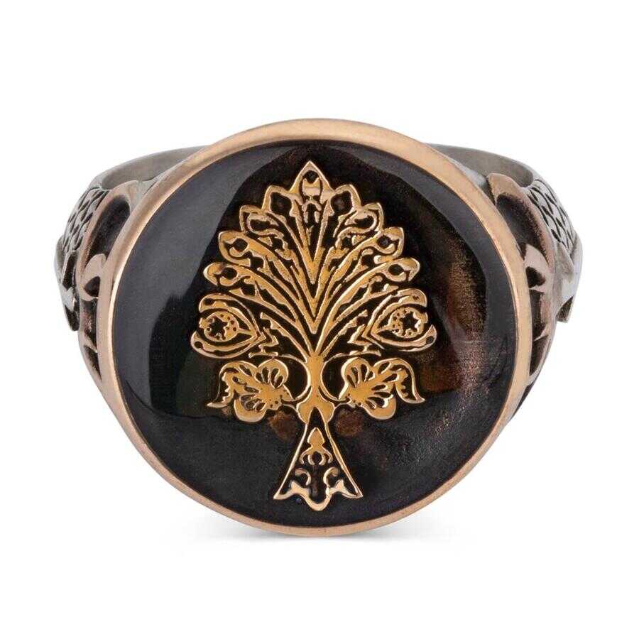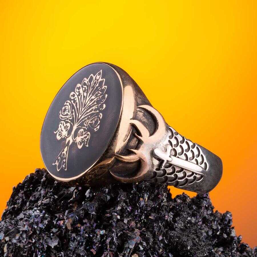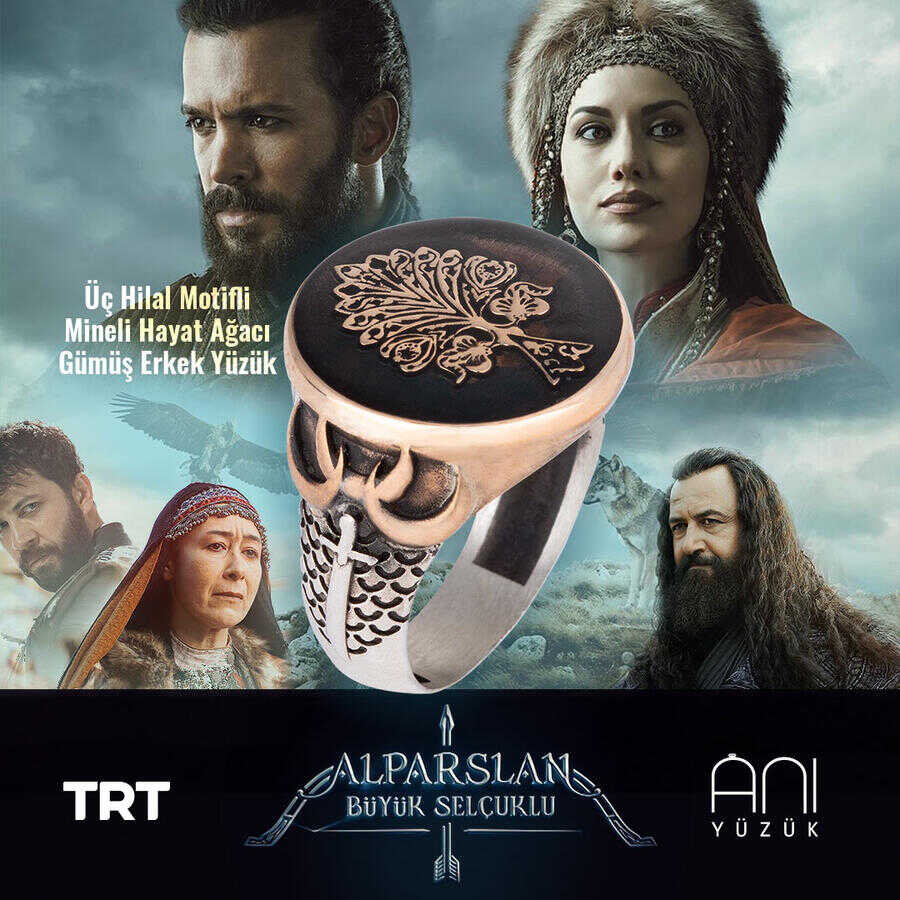 Yüzük üzerinde Hayat ağacı işlemesi, yanlarında Üç Hilal ve kılıç simgesi yer almaktadır.