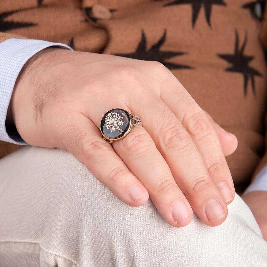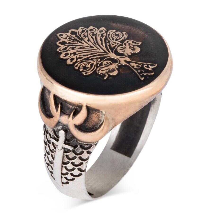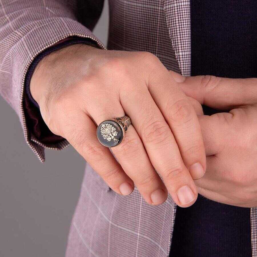 Üç Hilal Motifli Mineli Hayat Ağacı Gümüş Erkek Yüzük