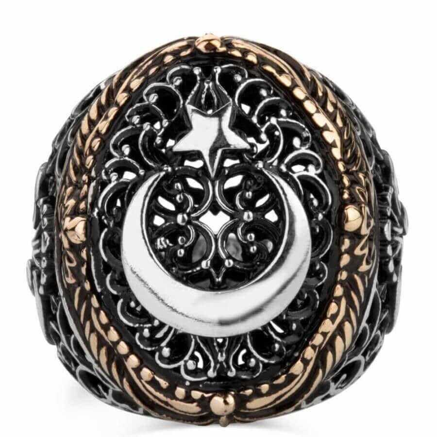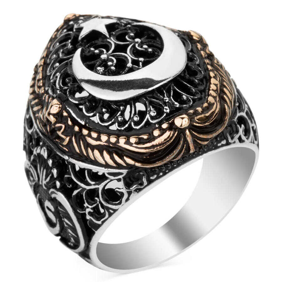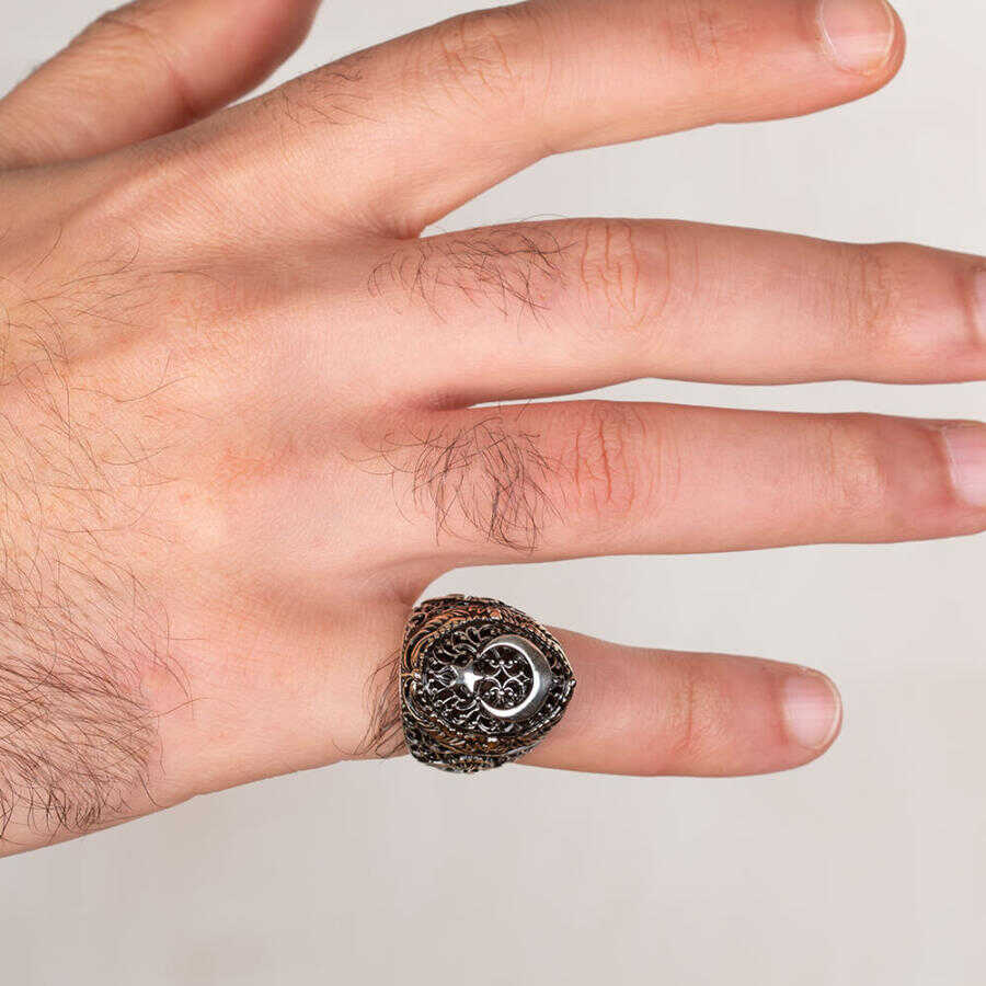 Vav Figürlü Ay Yıldız Motifli Gümüş Erkek Yüzük